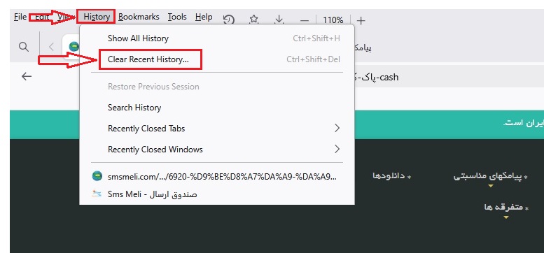 چنانچه گزینۀ: History را ندارید، بالای صفحه مانیتور، راست کلیک نمایید و گزینۀ: Menu Bar را تیک بزنید. بلافاصله بالای صفحه مانیتور شما، چندین گزینه اضافه میشود که یکی از آنها History میباشد. صفحه کوچکی زیر History باز میشود، روی: Clear Recent History کلیک نمایید. سپس صفحه کوچک دیگری باز میشود،